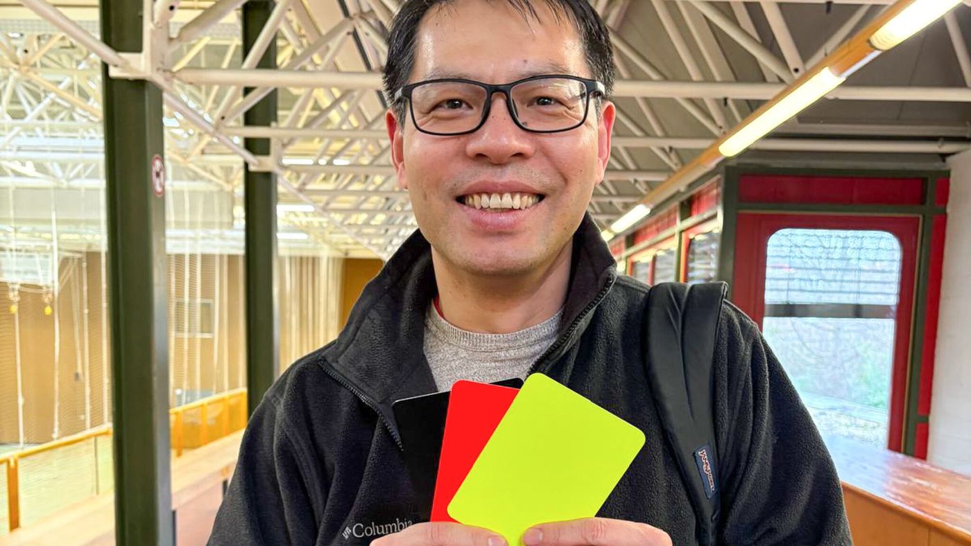 Auf dem Foto präsentiert Hongbo die drei Verwarnungskarten, die es beim Badminton gibt: gelb (Verwarnung), rot (Punktabzug) und schwarz (Disqualifikation).