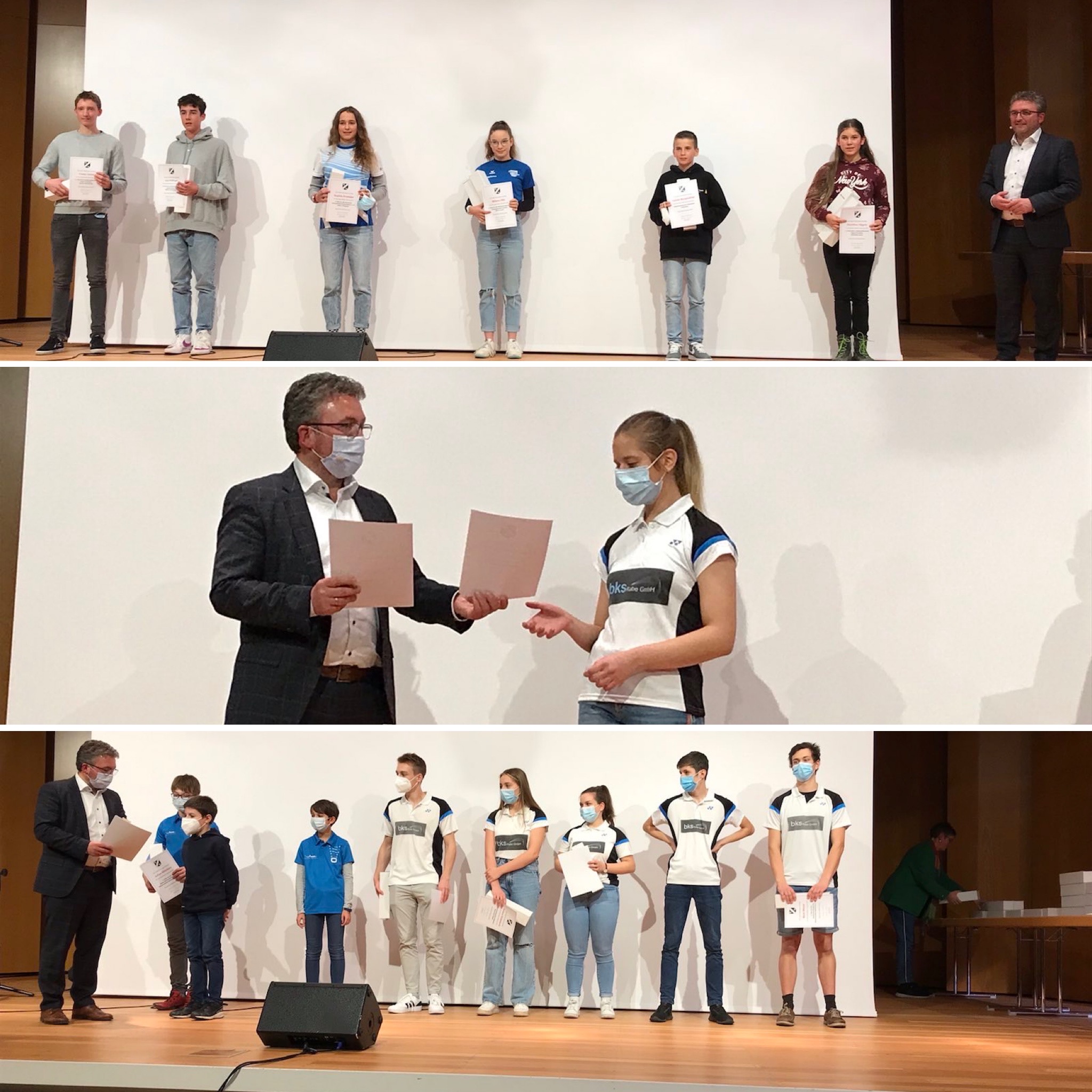 Sophia Kremsler (Leichtathletik) und Nadja Christine Reihle (Badminton) wurden für ihre gute Platzierungen auf Bundesebene ausgezeichnet. Sophia Kremsler erreichte den 4. Platz bei den Deutschen Jugendmeisterschaften Leichtathletik über 2000m Hindernis, Nadja Christine Reihle sicherte sich im Badminton Doppel den Deutschen Meisterschaften im Jahr 2020 den 3. Platz. Weitere Sportler die für Ihre Leistungen auf Landesebene (Baden-Württemberg) und Regionalebene (Südwürttemberg) im Badminton geehrt wurden: Alexander Huber, Patrick Spahr, Niklas Haug, Bent Meyer, Amera Dubinovic, Tabea Schäfer, Anne Sophie Portscheller, Lion Rullkötter, Julian Mikitisin, Artur Plaisant, Sarah Storz. Melina und Maximilian Hils wurden für ihre herausragenden Leistungen im Schwimmen geehrt. Wir gratulieren allen Sportlern zu dieser Auszeichnung der Stadt Mössingen und ihren herausragenden Leistungen im Sportjahr 2021 und wünschen ihnen einen guten Start in die neue Saison. Vielen Dank an die Stadt Mössingen, für die Durchführung der Leistungsehrungen.