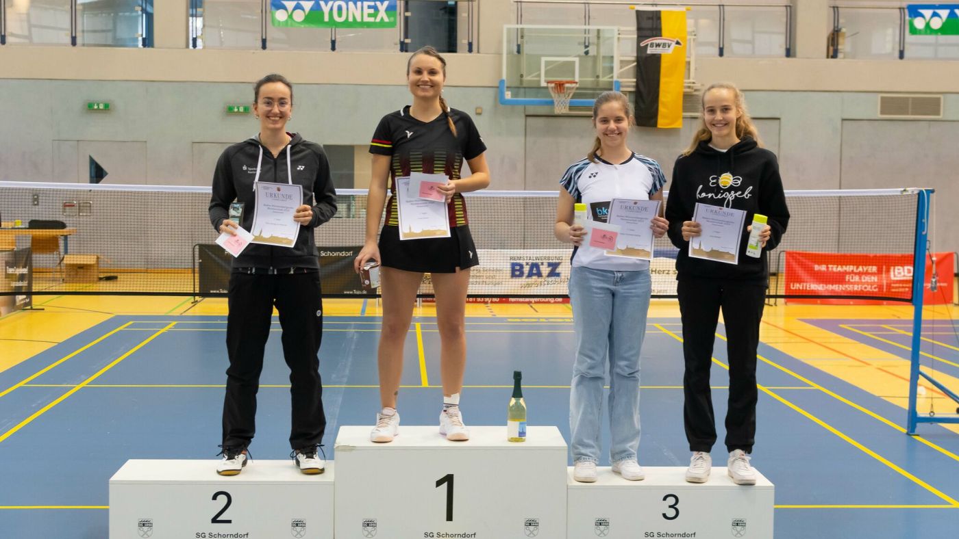 Im Dameneinzel war die erste Runde keine Herausforderung für Nadja-Christine Reihle, sie siegte gegen Julia Heinz (TV Lauffen) mit 21:12/21:6. Bundesligaspielerin Jennifer Löwenstein (SG Schorndorf), auf die Nadja bereits im Mixed getroffen war, wartete in der zweiten Runde. Nach verlorenem erstem Satz drehte die Mössingerin das Match, sie zeigte großen Einsatz, unter anderem mit mehreren spektakulären Hechtsprüngen. In einem harten Fight siegte sie schließlich mit 15:21/21:15 und 21:18. Nach kurzer Erholungspause folgte bereits das Viertelfinale gegen die ebenfalls bundesligaerfahrene Samira Schilli vom BC Offenburg. In dieser Partie fand Nadja gut zu ihrem druckvollen Spiel, gegen ihre krachenden Smashs fand ihr Gegenüber kein Mittel. Der Sieg mit 21:12 und 21:15 brachte sie ins sonntägliche Halbfinale.